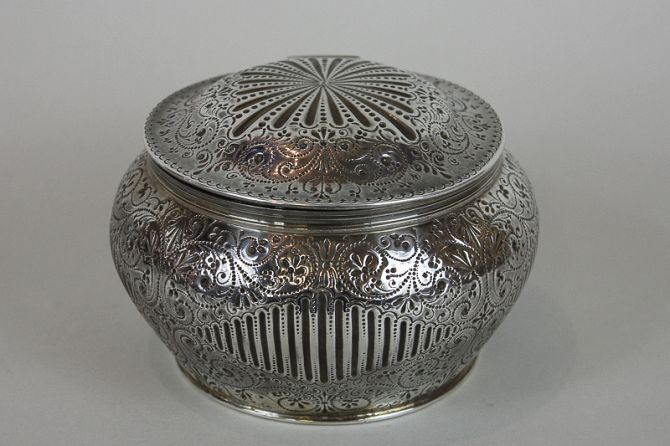 An early 19th century Scottish silver box, maker George Christie, Edinburgh, with hinged top and allover embossed decoration of reeded panels and scrolls, 11.5oz