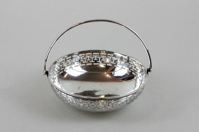 A George V Asprey's silver circular sweets basket, maker A & Co Ltd, London 1913, with pierced border and swivel handle, 6oz