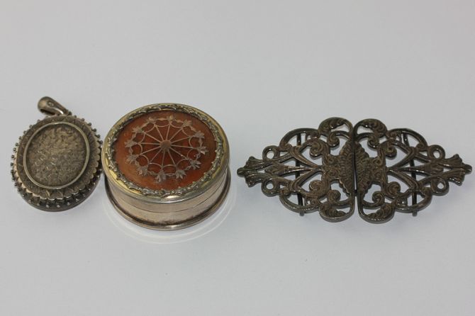 A silver locket floral engraved, Birmingham 1881; a silver nurses buckle; a silver powder box with inlaid tortoiseshell cover London 1909