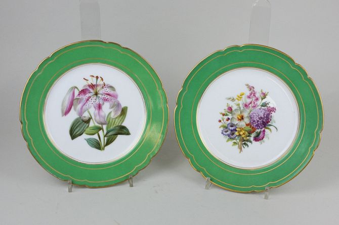 A pair of Davenport porcelain dessert plates, the centres painted with summer flowers in bright colours with gilt enriched borders (with rare 1830-40s Manufacturers to Their Majesty's mark), 24cm diameter; together with a pair of floral hand painted and green bordered dessert plates