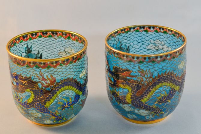 A pair of Chinese cloisonne bowls decorated with dragons chasing a flaming pearl with gilt rims and bases, 8cm high