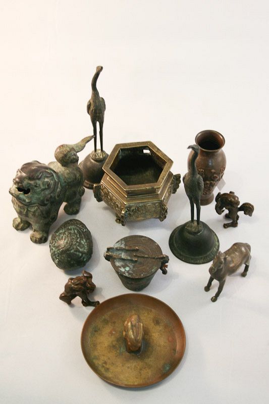 A collection of oriental and other bronze, brass and metal items to include a small Koro; a small vase; a set of weights in case; a bronze temple dog; two Stork table bells etc.