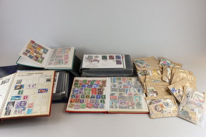 Three stamp albums containing British and world stamps, two albums of first day covers, other loose stamps and first day covers and a small collection of early to mid 20th century postcards