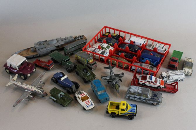 A collection of Corgi, Matchbox and other die cast metal toy vehicles in play worn condition
