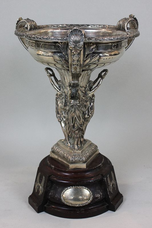 The Grand National silver trophy won by Music Hall, 24th March 1922, made by Elkington and Co Birmingham 1921. This large impressive trophy modelled as a circular bowl with three shell and leaf decorated scroll handles, supported by three winged 'angels', each holding a laurel crown, on triangular shaped base with scrolling leaf band, 46.5cm high, 227oz, on wooden plinth (NC)