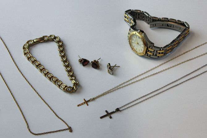 A pair of 9ct gold and heart shaped garnet earrings, a pair of 9ct gold stud earrings, a watch and bracelet and two crosses on chains, and a 9ct chain