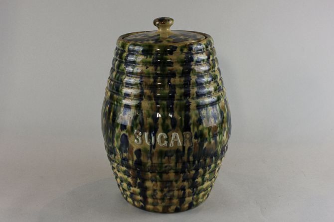 A late 19th century stoneware sugar jar with cover, modelled as a spirit keg, with sponge decoration in green, blue and brown, 34cm high