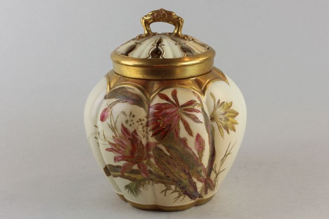 A Victorian Royal Worcester blush ivory pot-pourri jar and cover, the lobed body with hand painted flowers and enriched with gilt, with inner lid and pierced cover, shape No 1313 (date letter on base for 1890), 19cm high