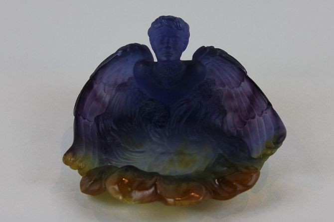 A Daum France coloured glass bowl modelled as an angel, the wings forming sides of bowl in shades of blue with brown edge to front, 15cm wide by 9cm high