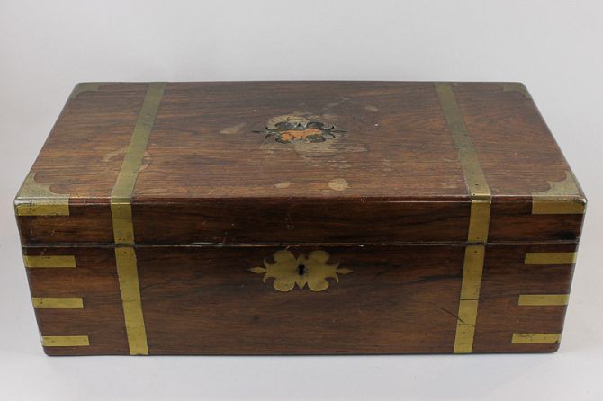 A Victorian rosewood brass bound writing slope with partly fitted interior and three secret drawers, 51cm by 27cm