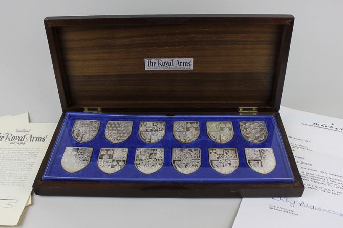 A set of twelve silver shield shaped medallions, 'The Royal Arms', each one with a different coat of arms, in case, limited to 7,500, 18.5oz, (cased)