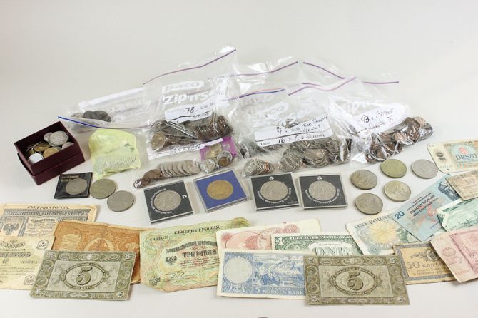 A collection of British and foreign coins to include crowns, half crowns, pennies, farthings, threepences, etc and some paper money