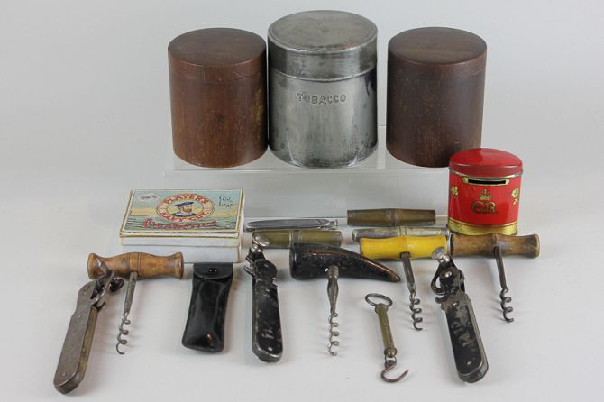 A collection of various corkscrews, tin openers, pewter and wood canisters, a penknife and various boxes