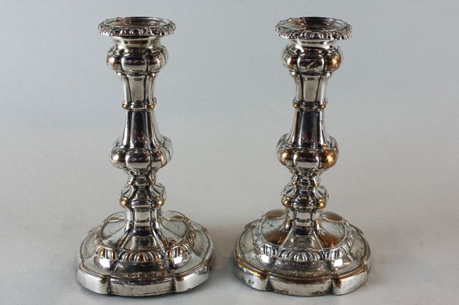 A pair of early 19th century Sheffield plated candlesticks with shaped columns on sloping bases, 18cm high