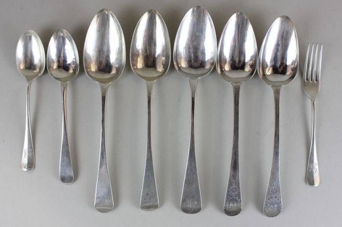 A pair of George III Old English pattern silver tablespoons with monogrammed and patterned handles, maker George Wintle, London 1800, together with a matched pair of George III Old English pattern tablespoons, a George IV tablespoon, Exeter 1823, an Irish dessert spoon, Dublin 1798, and an Edwardian christening set, 12oz