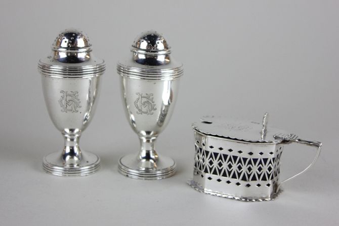 A pair of Edwardian silver peppers, maker Edward Barnard and Sons Ltd, together with a Victorian silver mustard, Sheffield 1898, with blue glass liner (all monogrammed), 5oz