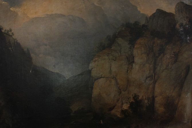 Circle of Frederick Richard Lee (1798-1879) upland river landscape, fishermen in foreground before a rock mass, oil on canvas, (unframed), 100cm by 120cm (NC)