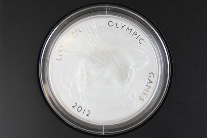A Royal Mint official London 2012 UK five ounce silver coin, boxed