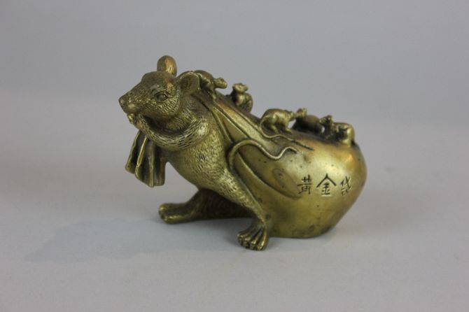 A Japanese brass model of a mouse carrying a sack with baby mice on top, character marks to side, 8cm tall