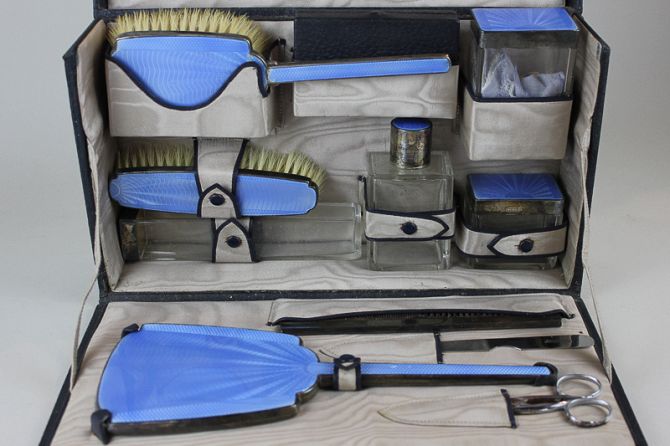 An Edward VIII Art Deco silver travelling dressing set with blue enamel decoration comprised of eleven items including a hand mirror, clothes brush, hairbrush and four silver topped glass jars, maker Adie Brothers Ltd, Birmingham 1936, in fitted travelling case