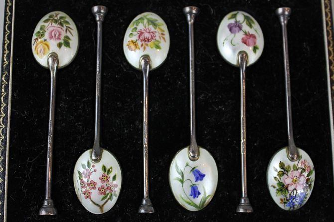 A cased set of Elizabeth II silver coffee spoons with floral enamel backs, Birmingham 1957, together with a cased set of silver teaspoons, Sheffield 1967