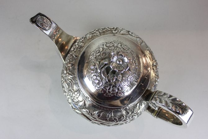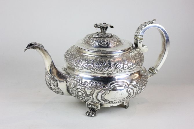 A George IV Irish silver teapot with embossed floral body and flower bud finial, maker James Le Bas, Dublin 1825, 27oz, (a/f - foot missing)