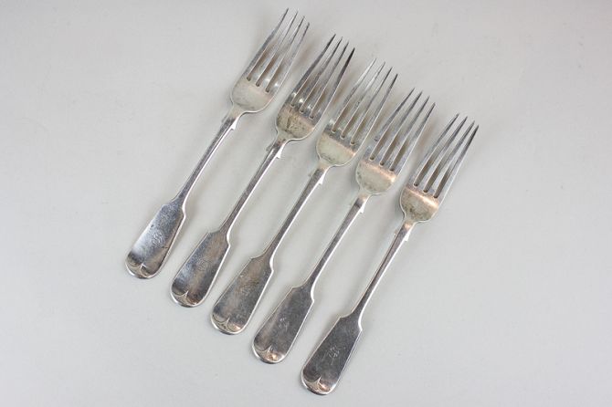 A set of five Victorian silver table forks, maker James & Josiah Williams, Exeter 1869, monogrammed, 10.5oz