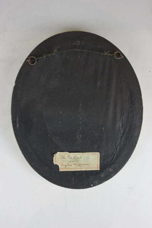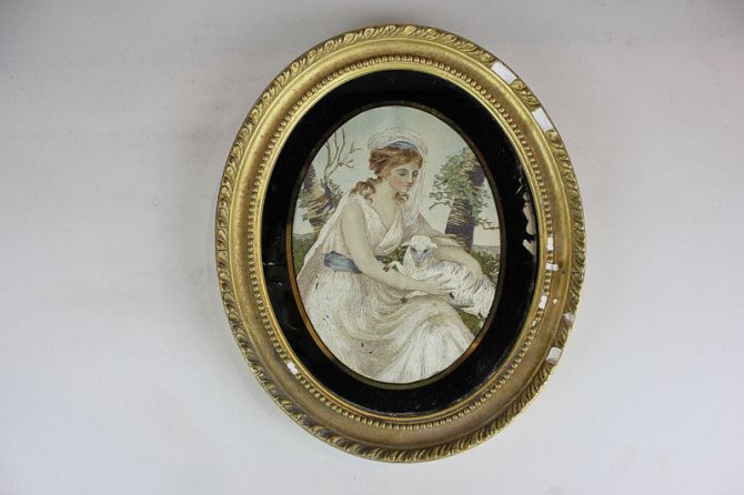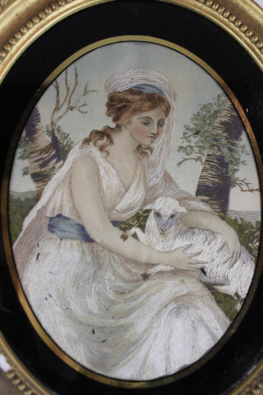 After Angelica Kauffmann (19th century), The Pet Lamb, oval embroidered panel in gilded gesso frame, 13cm by 17cm