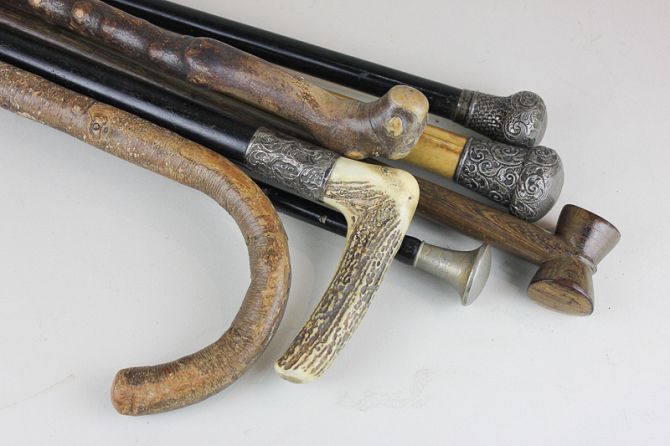 Two silver topped walking canes, four various walking sticks, one with a horn handle and a ladies umbrella