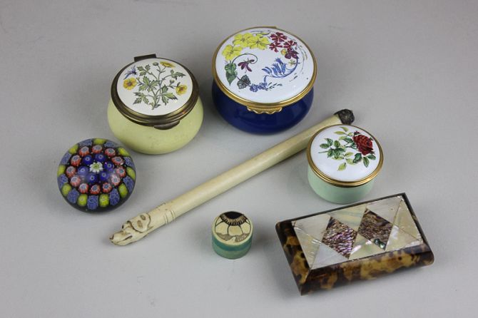 Three enamel boxes, a Scottish millefiori glass paperweight, a blond tortoiseshell and mother of pearl trinket box, a bone taper stick carved with a dog's head and a very small circular box