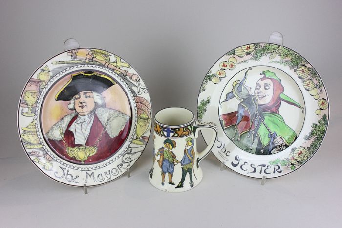 Two Royal Doulton character plates, The Jester and The Mayor, and a Royal Doulton Three Musketeers tankard