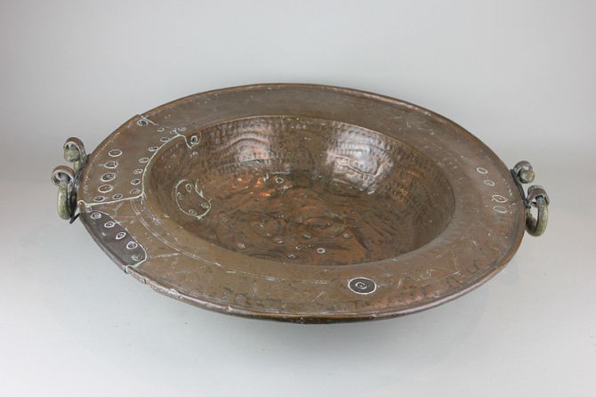 A North American copper dish with beaten decoration and two ring handles, 49cm diameter