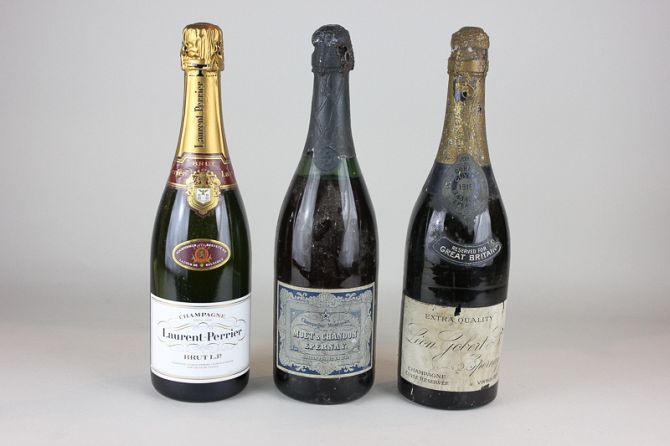 A bottle of 1919 Leon Gobert Champagne, a bottle of Moet & Chandon Champagne, and a Laurent Perrier Brut Champagne