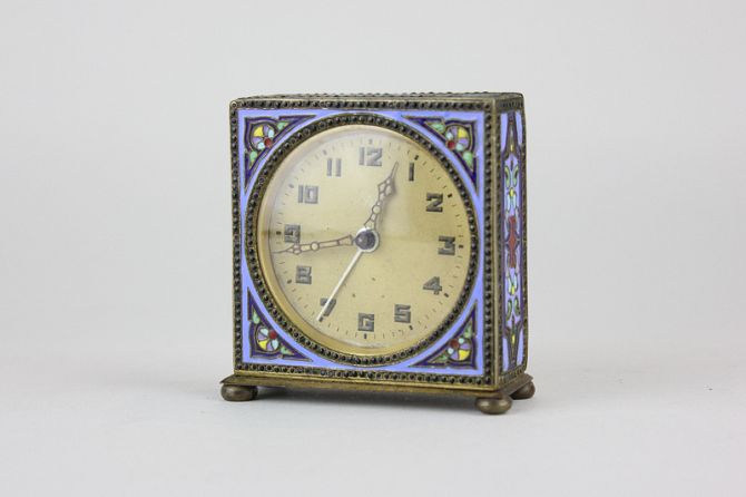 A German enamelled alarm clock, the bronzed circular dial with Arabic numerals, 6.5cm by 7cm