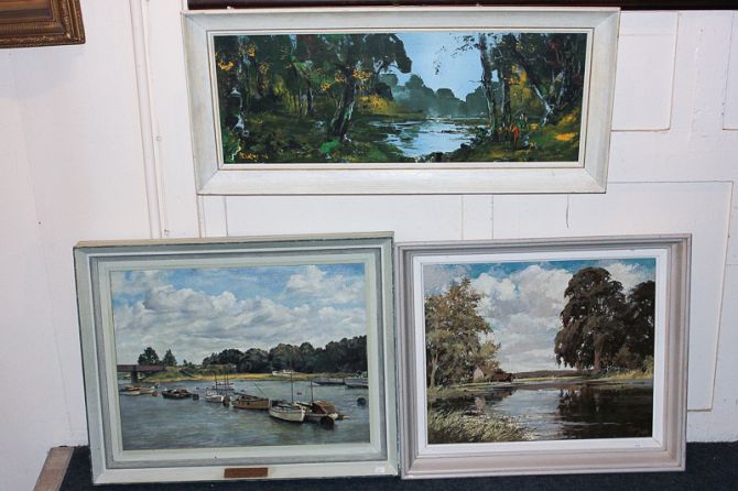 Three 20th century oils, C Lynch, River Avon, signed and dated 1958, 45cm by 64cm; Muriel England, view titled Above Bursledon Bridge; and George R Deakins, Landscape, oil on board, signed, 30cm by 81cm