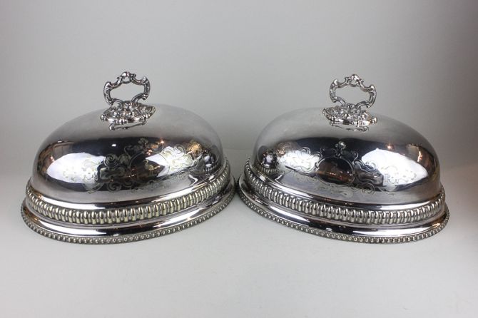 A pair of silver plated domed shaped oval covers, with engraved decoration and gadroon border 35cm