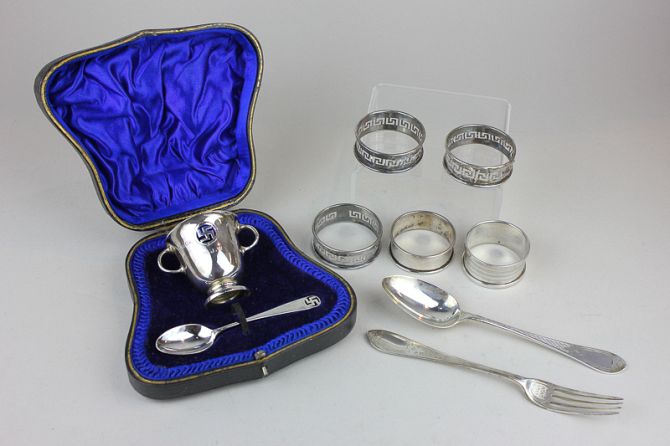 A George V cased silver christening set of egg cup and spoon, five various napkin rings, and an engraved christening spoon and fork
