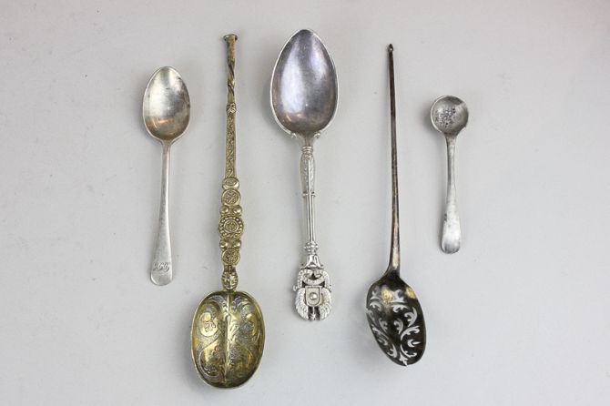 An Edward VIII silver anointing spoon, a silver salt spoon, and coffee spoon, a silver teaspoon with crested handle and an unmarked Georgian mote spoon (a/f), 2.5oz gross