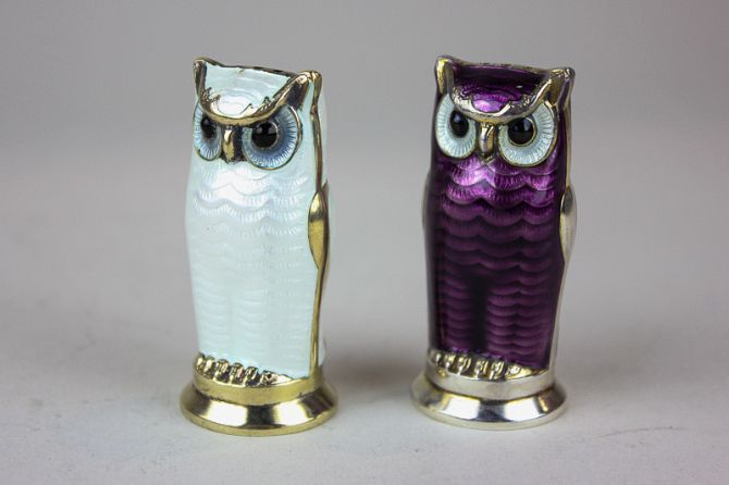 A pair of David Andersen silver and enamel owl salt and pepper in purple and white, D A Norway, sterling silver to base, 5.5cm high