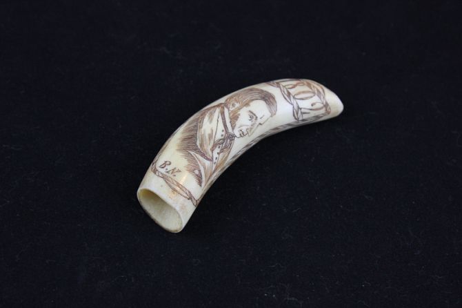 A marine ivory scrimshaw carved with a profile of a gentleman and a date of 1802, initialled B.N. and named Captain D.N. Ward, 8.5cm