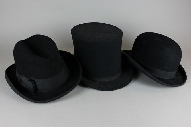 A G A Dunn & Co top hat, a Woodrow bowler hat and a Henry Heath Ltd trilby