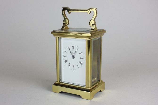 A brass and bevelled glass cased carriage clock, the white enamel face marked Henley, with Roman numerals, 16cm