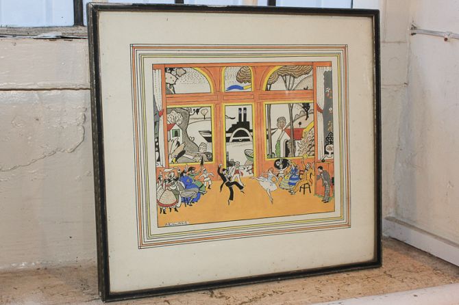 E Hulben White, dancers in a room with view of a boat through large windows, pen and ink with watercolour, signed, 33cm by 36cm, and another in monotones of dancers on a stage set