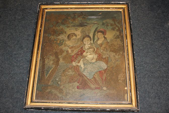 An 18th century silk embroidered picture of the Madonna and child attended by angels in woodland (a/f) (NC)