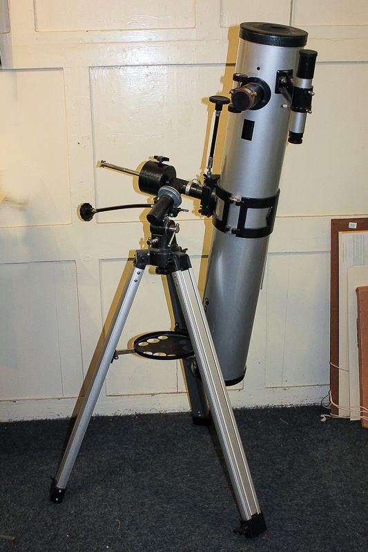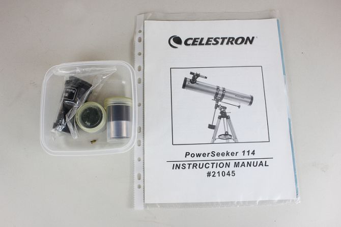 A Celestron Power Seeker 114 telescope on stand with paperwork and lenses