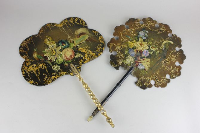 Two Victorian black lacquered papier mache face screens depicting birds and flowers, with gilt embellishment