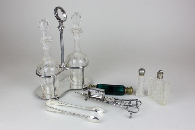 A white metal cruet with a pair of cut glass bottles, a double ended green glass travelling bottle, two glass scent bottles, a candle snuffer and a pair of tongs