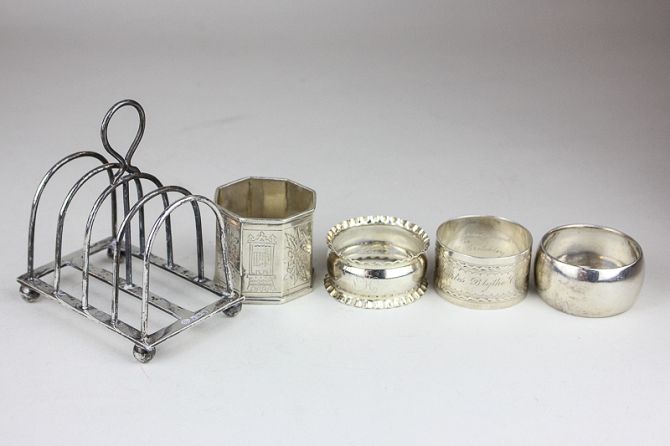 A George V silver toast rack, Sheffield 1910, 8cm, and four various napkin rings