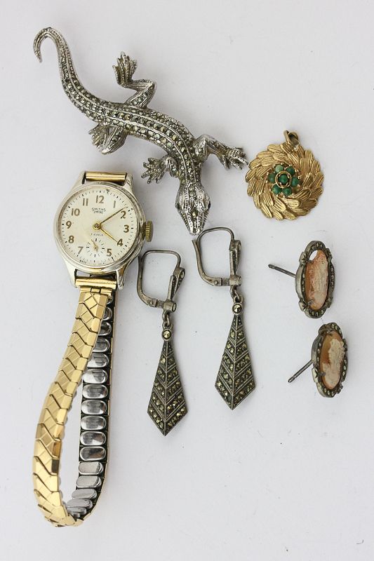 A gold and turquoise pendant; a marcasite lizard brooch and two pairs of earrings and a ladies Smiths watch