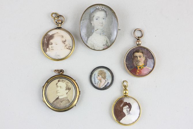A 19th century 9ct gold photograph fob, three rolled gold portrait fobs, a 19th century portrait miniature brooch, and another miniature marked Roscins